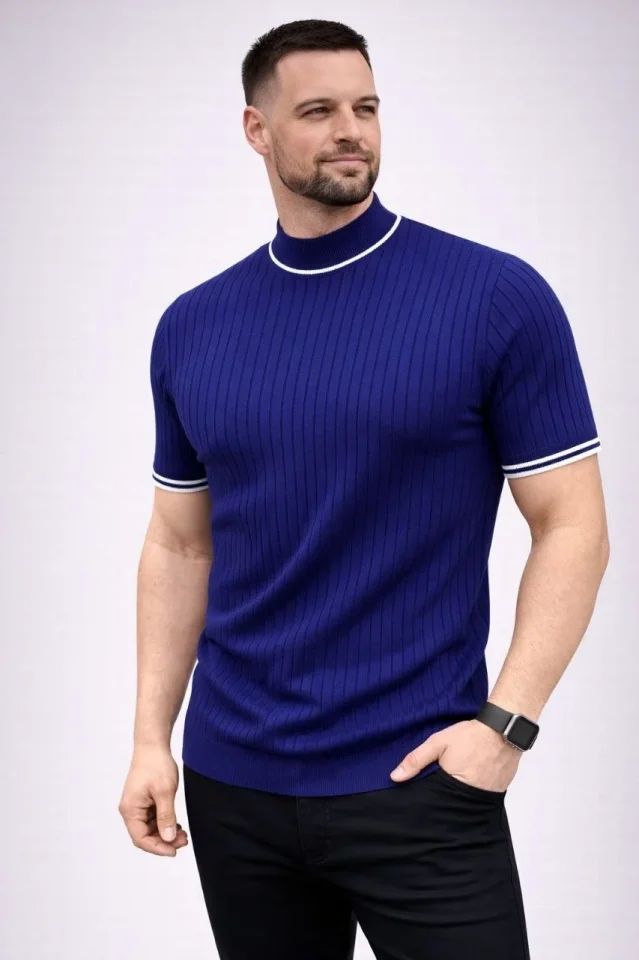 Erkek Fitilli Triko Dokuma Kısa Kol Tişört Yarım Boğaz Modern Yazlık T-Shirt - Lacivert
