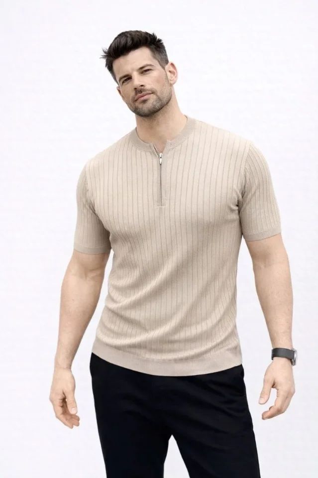 Erkek Kısa Kol Fitilli Triko T-Shirt Yazlık Hakim Yaka Tişört - Bej