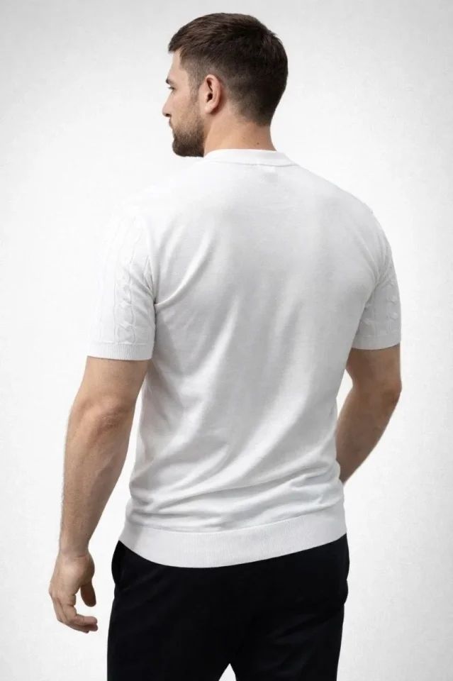 Erkek Yazlık Triko Dokuma Tişört Kısa Kol Bisiklet Yaka Örgü Desenli T-Shirt - Beyaz