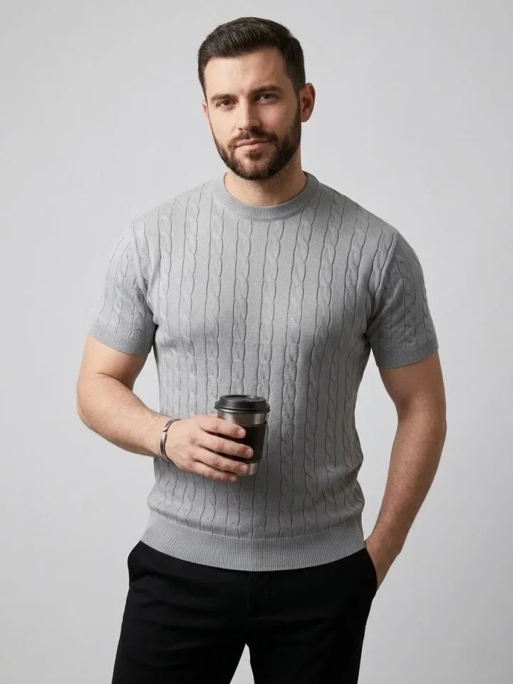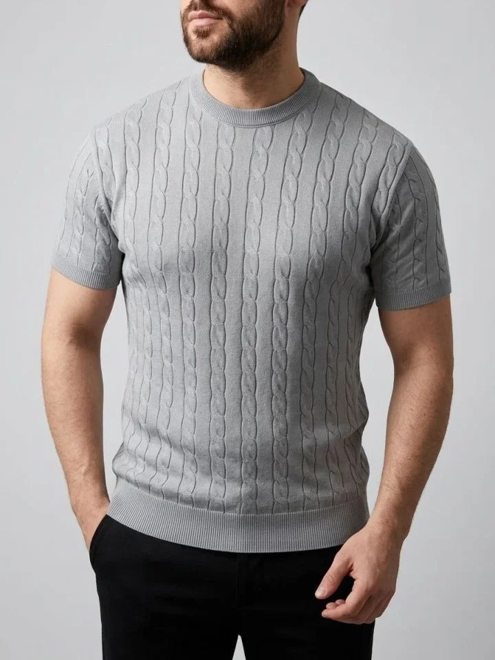 Erkek Yazlık Triko Dokuma Tişört Kısa Kol Bisiklet Yaka Örgü Desenli T-Shirt - Gri