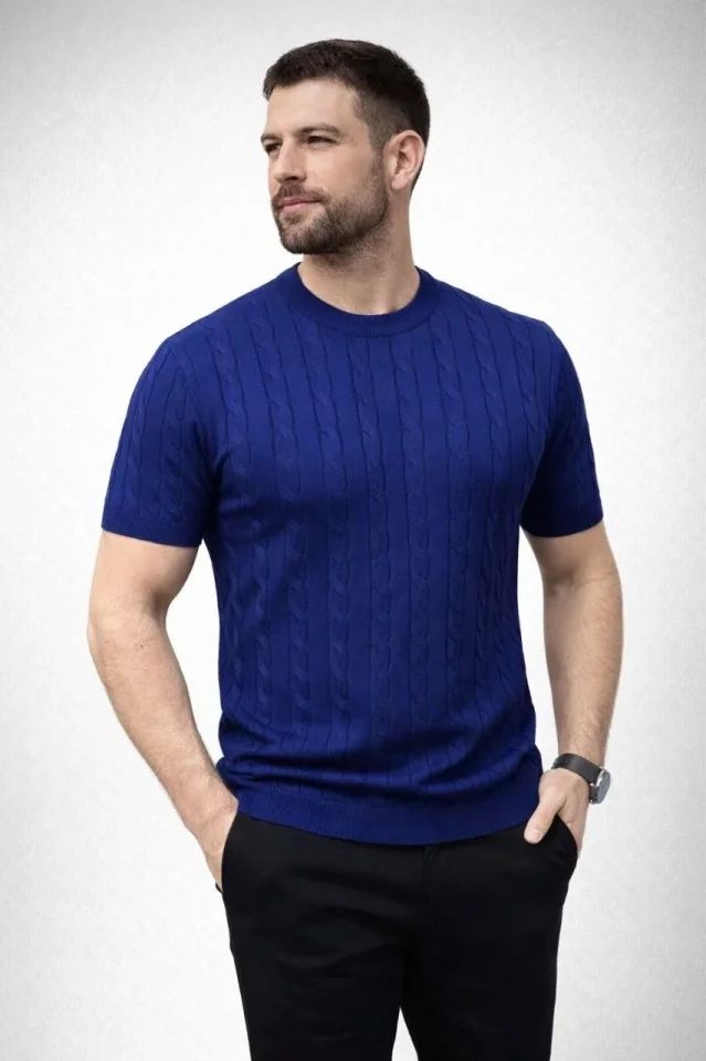 Erkek Yazlık Triko Dokuma Tişört Kısa Kol Bisiklet Yaka Örgü Desenli T-Shirt - Lacivert