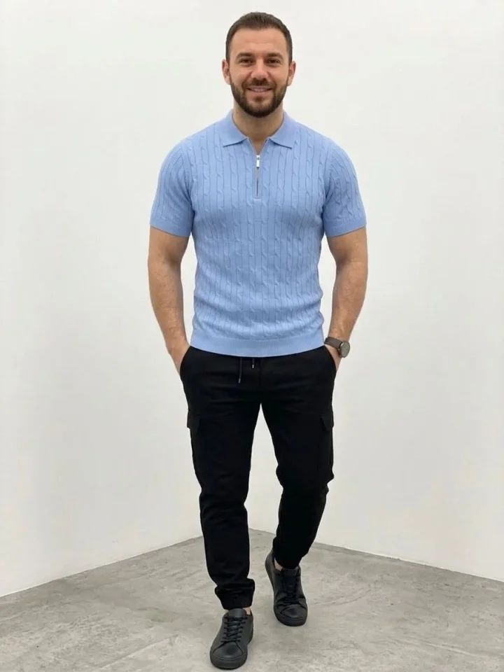 Erkek Yazlık Triko Saç Örgü Tişört Kısa Kol Polo Yaka Fermuarlı T-Shirt - Bebe Mavisi