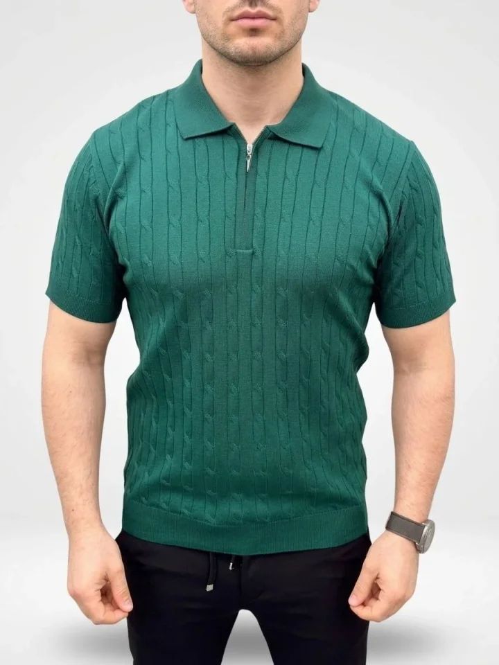 Erkek Yazlık Triko Saç Örgü Tişört Kısa Kol Polo Yaka Fermuarlı T-Shirt - Haki