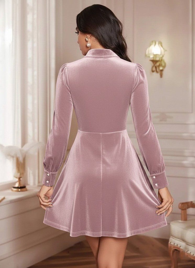 Kadın Uzun Kollu Yakalı Tül Detaylı Incili Mini Kadife Elbise