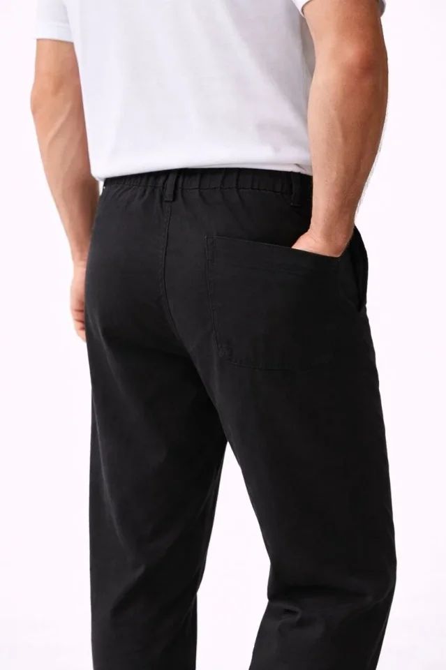 Erkek Keten Cepli Pantolon Lastikli Bel Bağcıklı Önden Fermuarlı - Siyah