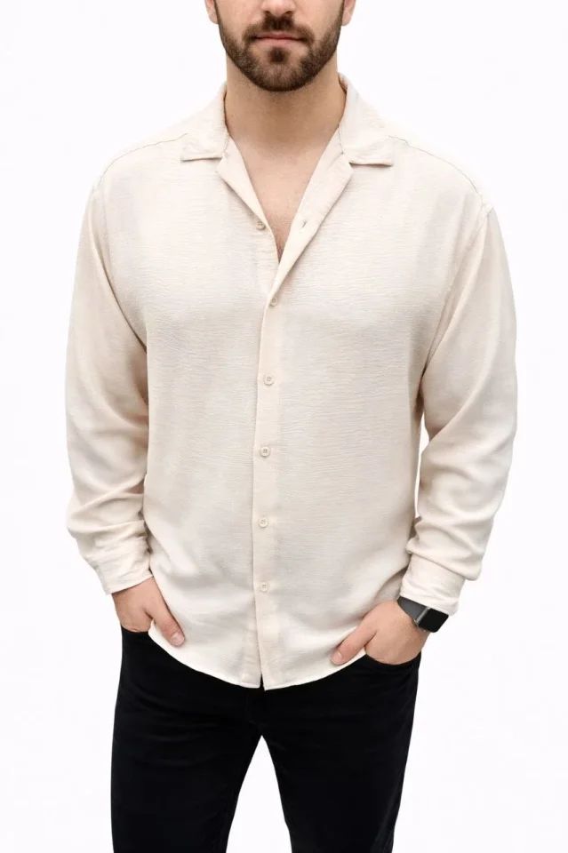 Erkek Aerobin Kumaş Oversize 4 Mevsim Uzun Kollu Rahat Kalıp Gömlek - Bej