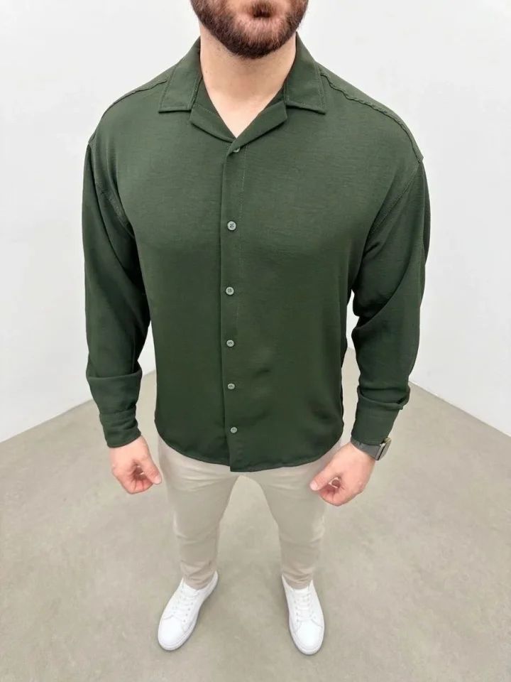 Erkek Aerobin Kumaş Oversize 4 Mevsim Uzun Kollu Rahat Kalıp Gömlek - Haki
