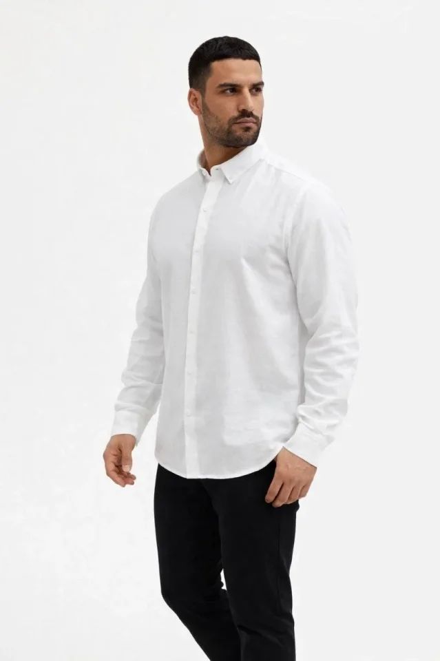 Erkek KETEN Kumaş Oversize Uzun Kollu Rahat Kalıp Gömlek - Beyaz