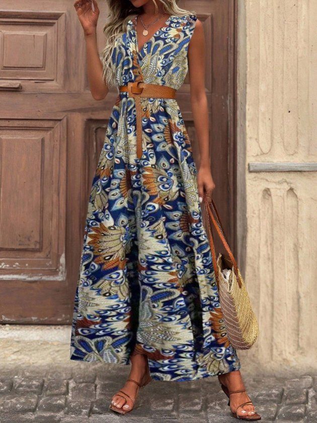 Kadın Askılı Kruvaze Yakalı Uzun Desenli Kemersiz Süprem Elbise