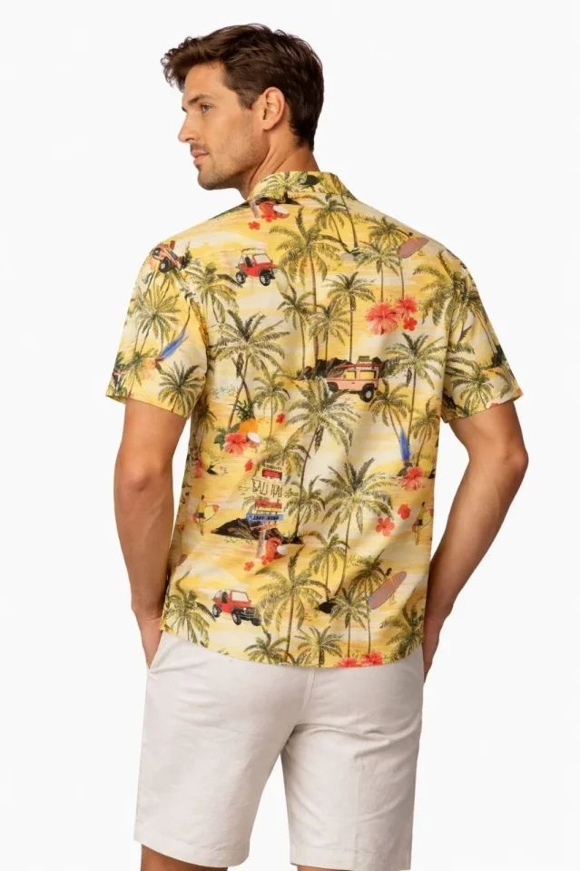 Erkek Tropikal Palmiye Desenli Kısa Kol Gömlek Hawaii Tarz Yazlık Rahat Kalıp - Desenli