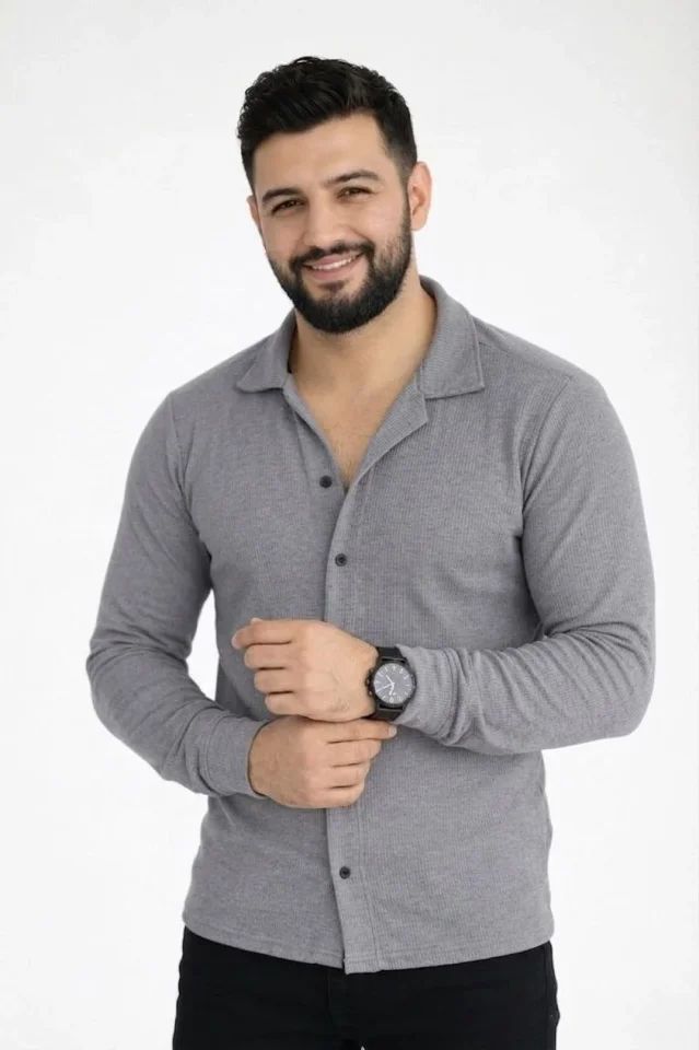 Erkek Waffle Kumaş Uzun Kollu Düğmeli Açık Yaka Regular Fit Gömlek - Füme