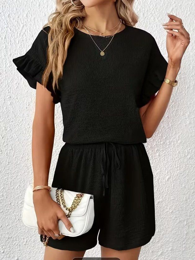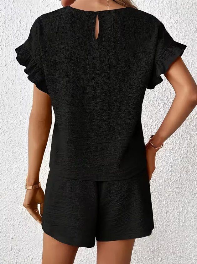 Kadın Kısa Kollu Bisiklet Yaka Bürümcük Bluz Ve Kısa Short Ikili Takım