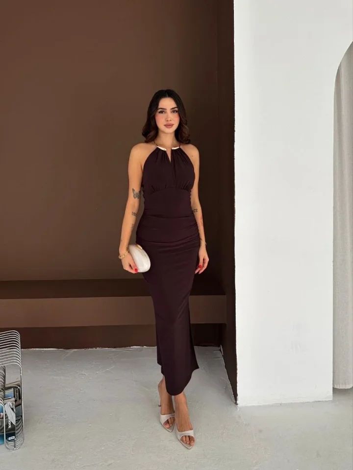 Uzun Abiye Elbise Yırtmaçlı Sırt Dekolteli Şık Gece Elbisesi - Kahverengi