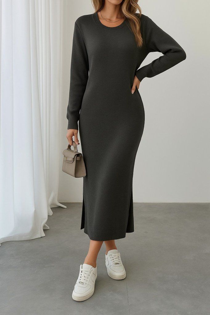 Kadın Uzun Kollu Bisiklet Yaka Yırtmaç Detay Triko Midi Boy Elbise