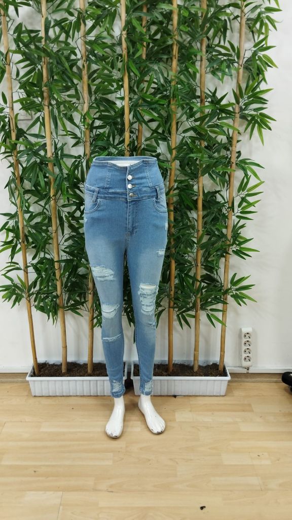 Kadın Yüksek Belli önden Düğmeli Yırtık Detaylı Kot Pantolon