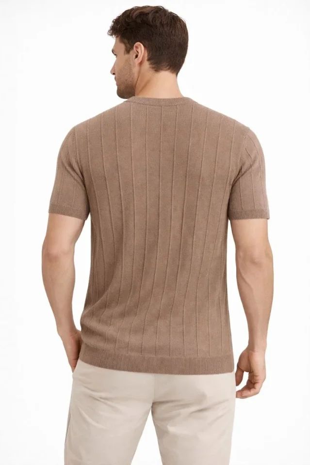 Erkek Yazlık Fitilli Triko Tişört Kısa Kol Bisiklet Yaka T-Shirt - Kahverengi
