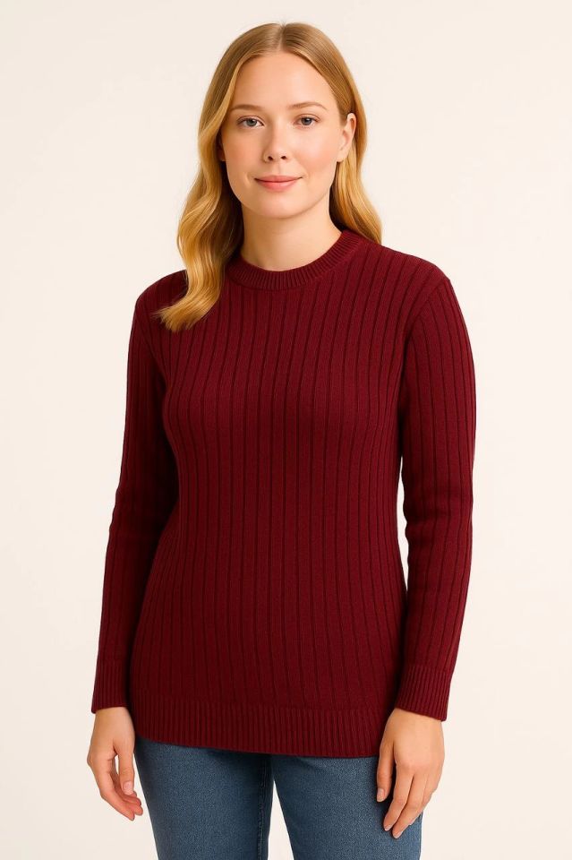 Bisiklet Yuvarlak Yaka Triko Kazak Pamuklu Kalın Fitilli Dokuma, Regular Fit Uzun Kollu Kışlık Model - Bordo