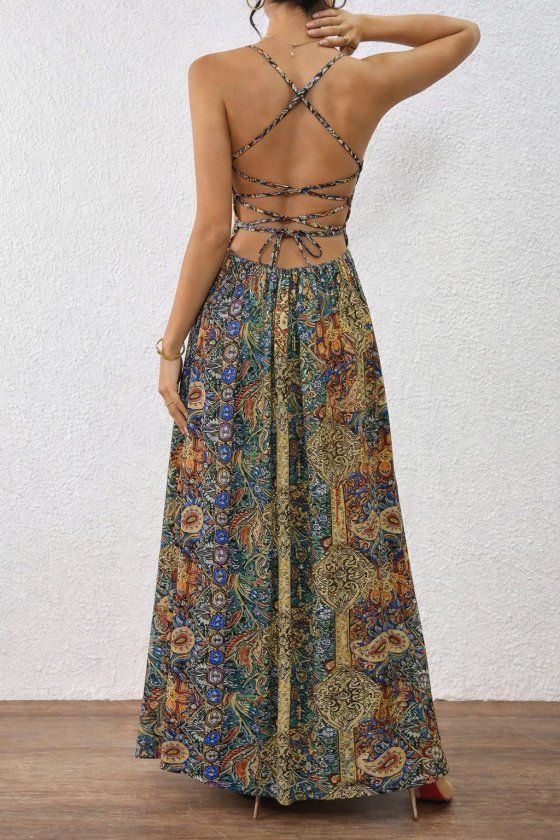 Kadın Ip Askılı Arkadan çapraz Kesim Detaylı Uzun Desenli Süprem Elbise