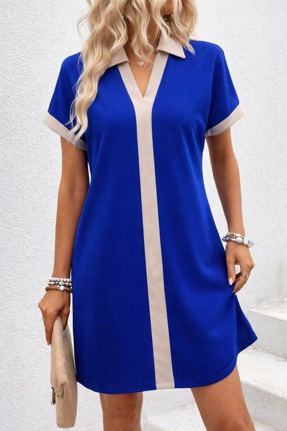 Kadın Kısa Kollu V Yakalı Onden şerit Detaylı Yakalı Kısa Janjan Krep Elbise