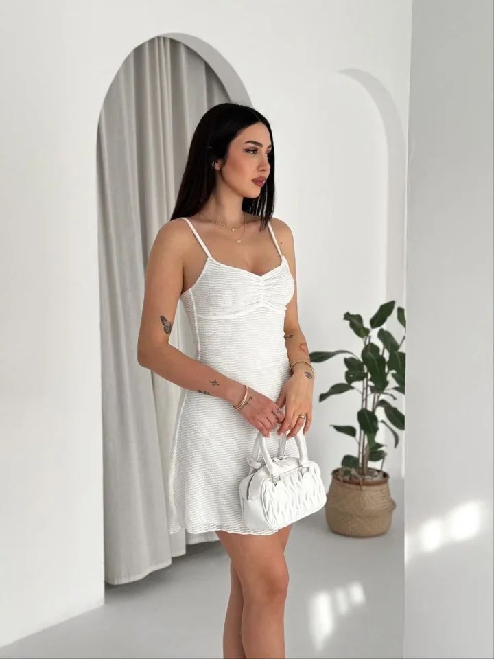 Askılı Mini Elbise Drapeli Göğüs Detay Likralı Yazlık Fit - Beyaz