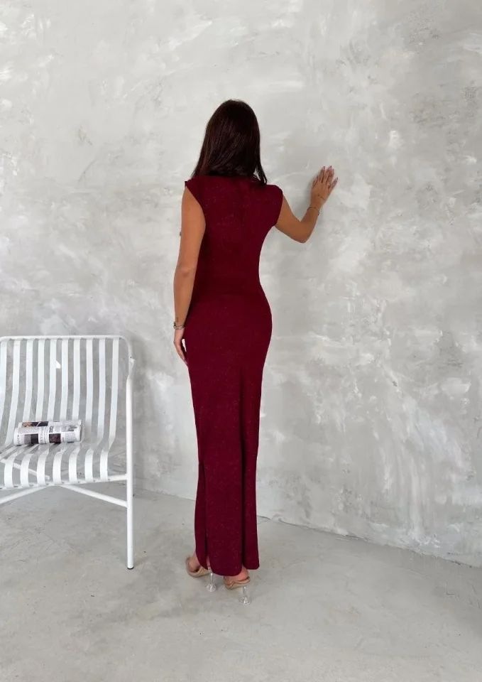 Likralı Simli Kumaş Yandan Yırtmaçlı Uzun Elbise Şık Kolsuz Abiye - Bordo
