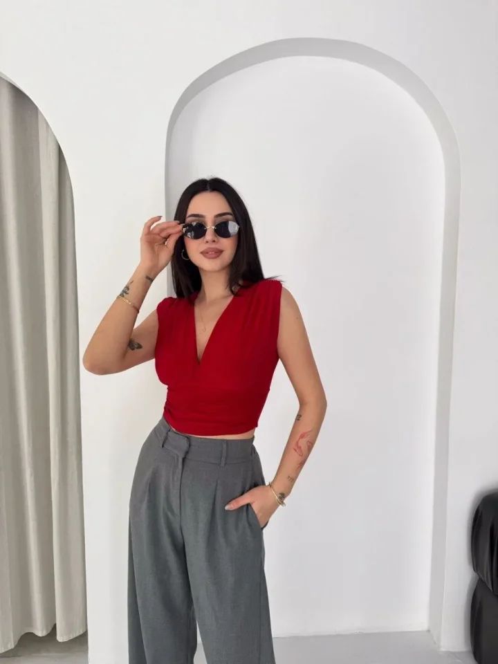 Vatkalı Kolsuz V Yaka Drapeli Crop Bluz Likralı Fit - Kırmızı