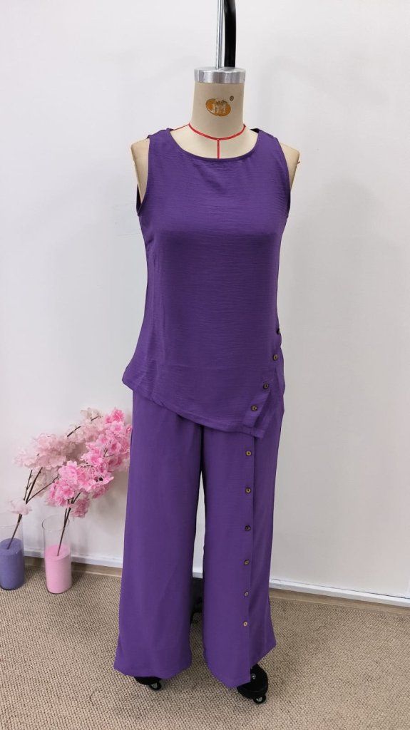 Kadın Askılı Yuvarlak Yakalı önü Asimetrik Detaylı Düğmeli Aerobin Bluz Ve Pantolon Ikili Takım