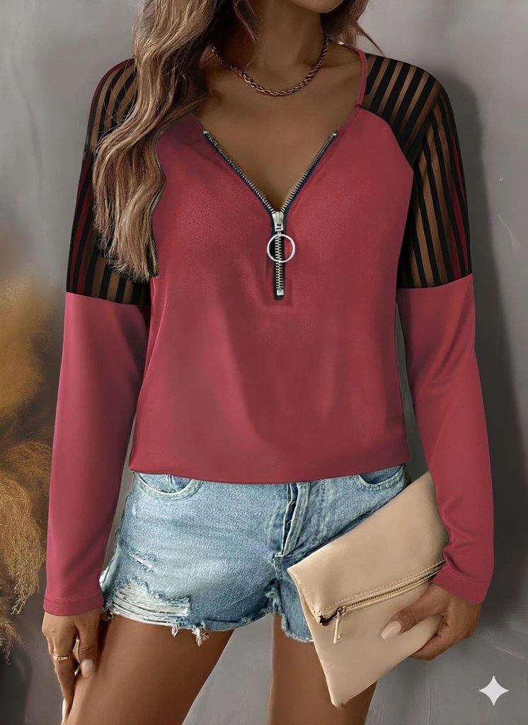 Kadın Uzun Kollu Yakadan Fermuarlı Viskon Bluz