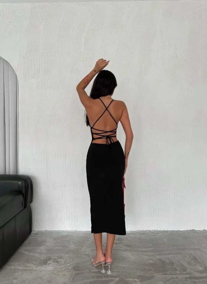 İp Askılı Sırt Dekolteli Bağlama Detaylı Yırtmaçlı Midi Elbise - Siyah