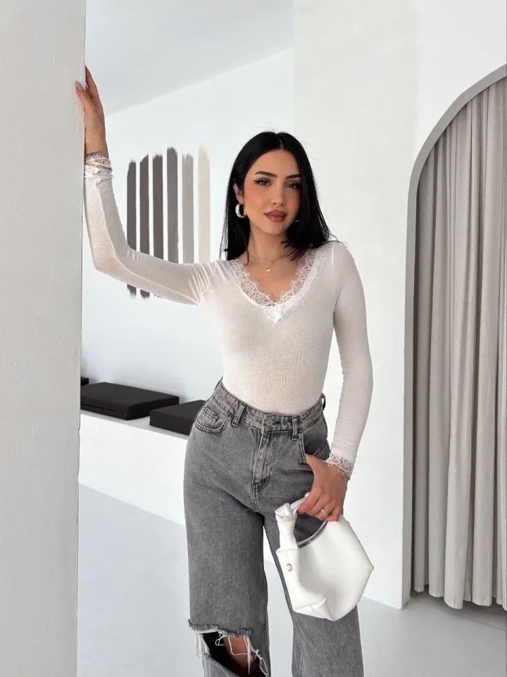 Dantel Detaylı V Yaka Arkası V Yaka Kaşmir Dokulu Uzun Kollu Bluz - Beyaz