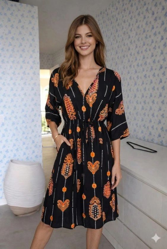 Etnik desenlerin zamansız ruhunu modern bir kesimle buluşturan bu midi boy elbise, gardırobunuza bohem bir zarafet katıyor. V yaka tasarımıyla boyun hattınızı zarifçe vurgularken, belindeki ayarlanabilir bağçık detayı sayesinde silüetinizi dilediğiniz gibi formlandırabilirsiniz. Akışkan kumaşı ve hareketli desenleri ile hem günlük şehir gezintilerinde hem de sahil şıklığında size eşlik edecek bu parça, konfor ve estetiği bir arada sunar.