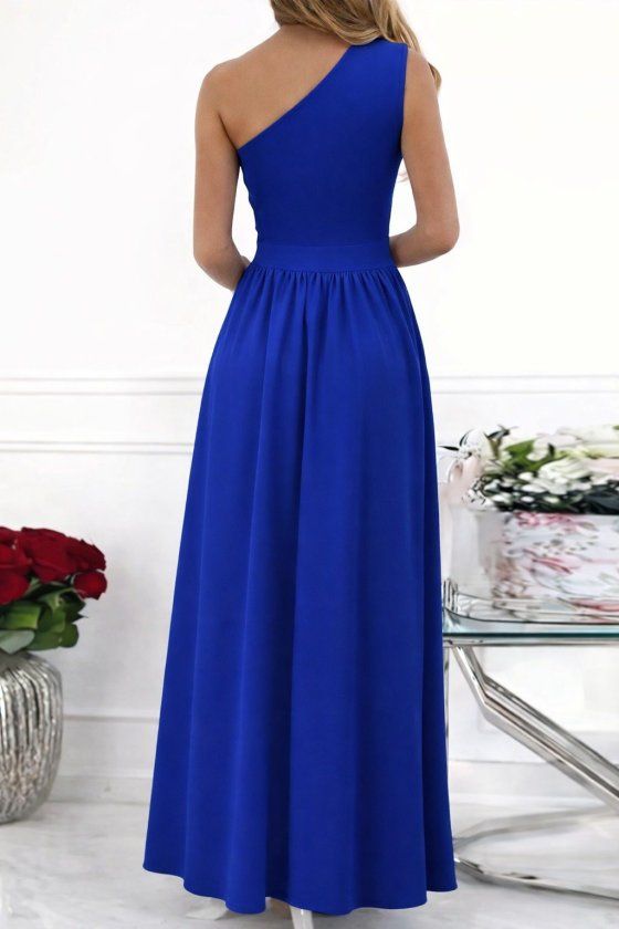 Kadın Omuzlardan Açık Asimetrik Yaka Detaylı Yırtmaçlı Maksi Boy Janjan Krep Elbise
