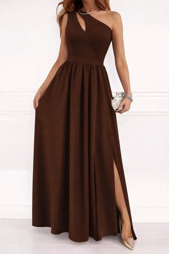 Kadın Omuzlardan Açık Asimetrik Yaka Detaylı Yırtmaçlı Maksi Boy Janjan Krep Elbise