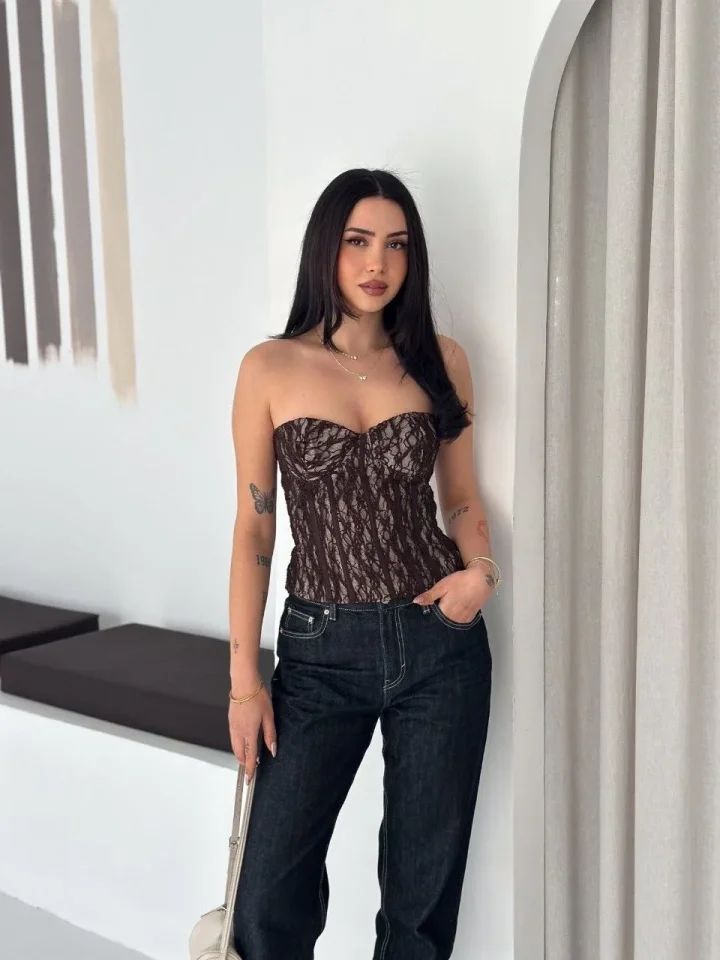 Fermuarlı Dantel Korse Straplez Bustiyer Transparan Şık Top - Kahverengi