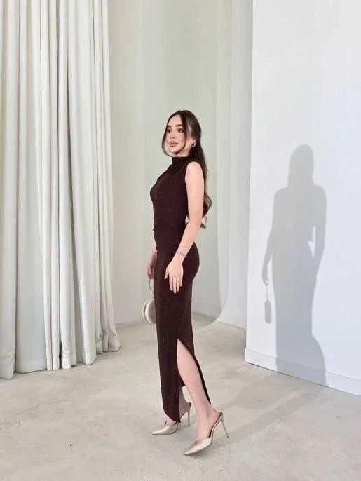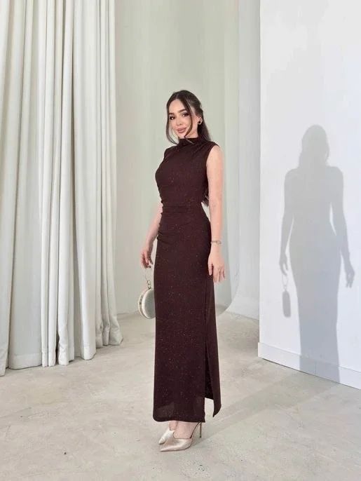 Likralı Simli Kumaş Yandan Yırtmaçlı Uzun Elbise Şık Kolsuz Abiye - Kahverengi
