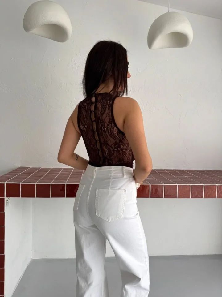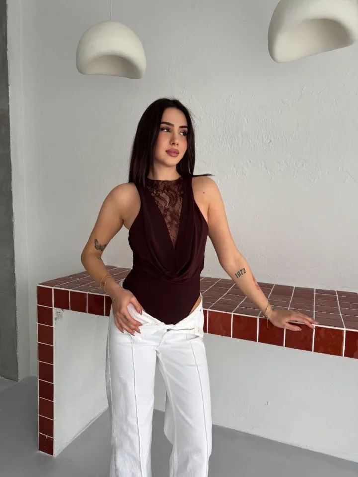 Dantel Detaylı Derin Dekolte Body Şık Kolsuz Yazlık Bodysuit - Kahvrenegi