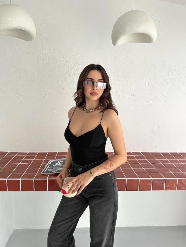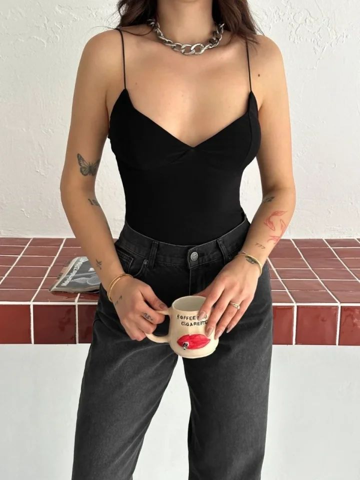 Derin Dekolte Askılı Body Sırt Dekolteli Şık Kolsuz Yazlık Bodysuit - Siyah