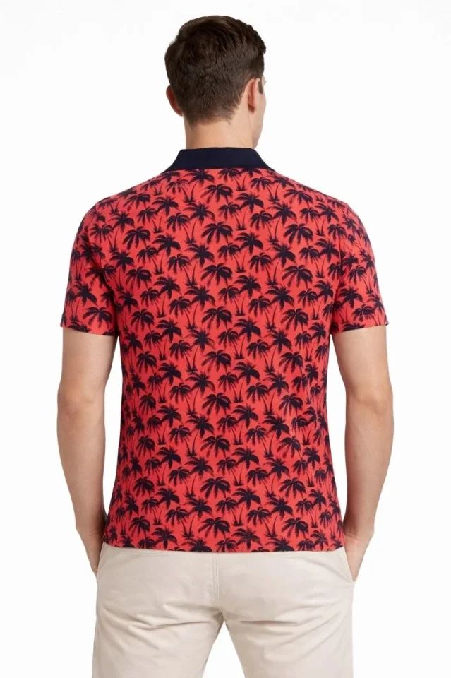 Erkek Pike Kumaş Polo Yaka Palmiye Desenli Tişört Kısa Kol Yazlık T-Shirt - Kırmızı