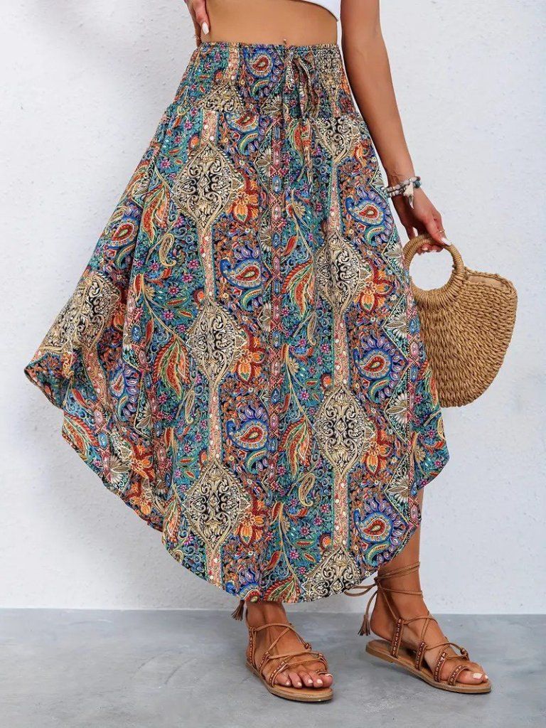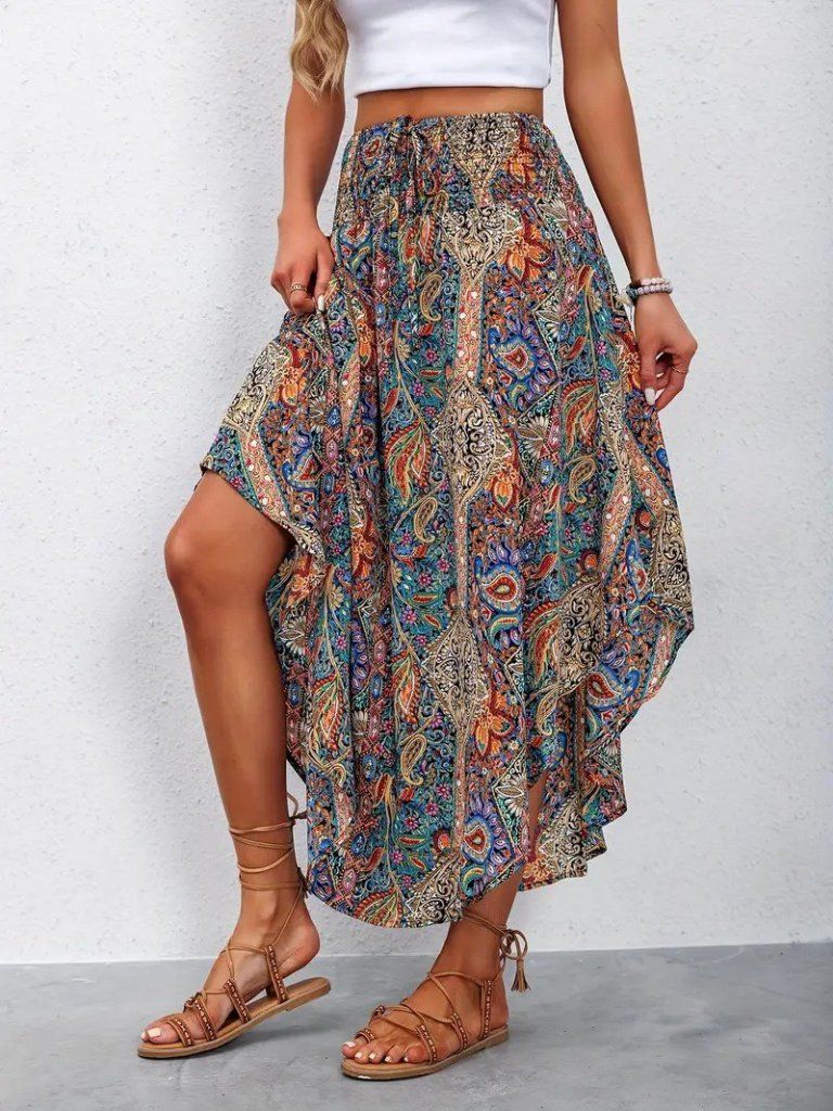Kadın Beli Lastikli Bağcıklı Asimetrik Kesim Detaylı Desenli Bürümcük Etek