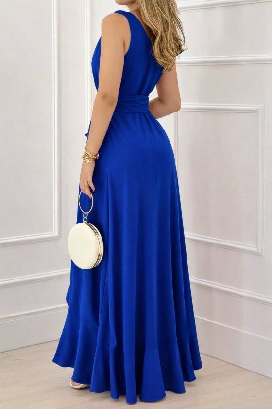 Kadın Askılı Kruvaze Yakalı önü Volanlı Uzun Krep Elbise