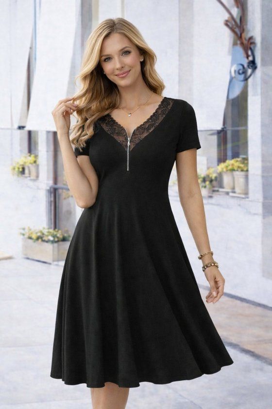 Kadın Kısa Kollu Dantel V Fermuar Yakalıuzun Viskon Elbise