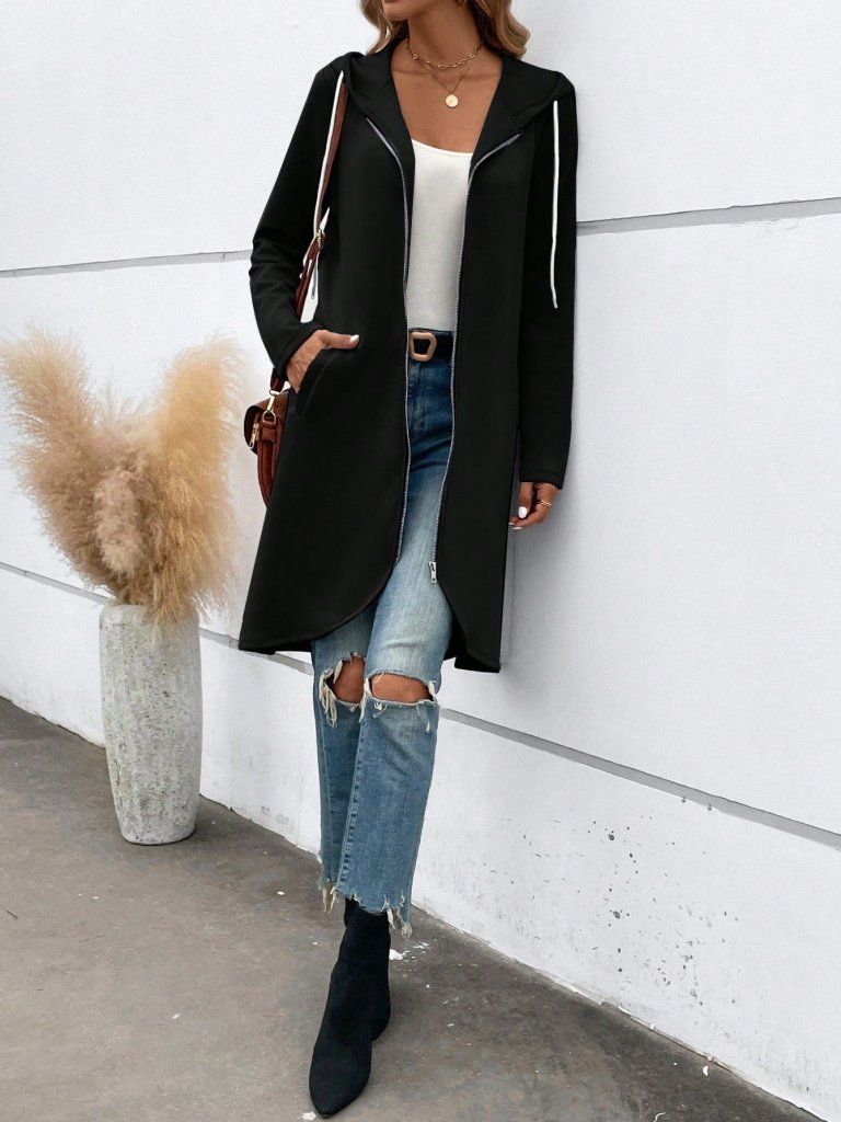 Kadın Uzun Kollu Kapşonlu önden Fermuarlı Midi Dalgıç Ceket