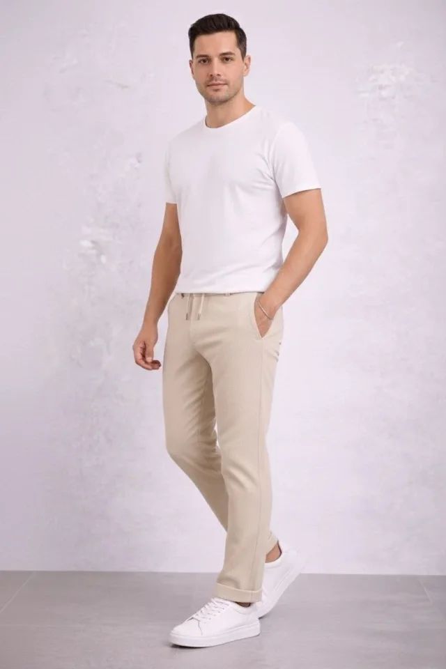 Erkek Diagonel Mikro Dokulu Duble Paça Cepli Pantolon Bağcıklı Bel, Modern Kesim - Krem