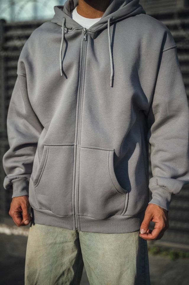 Oversize Tam Fermuarlı Uzun Kol Hırka - Gri
