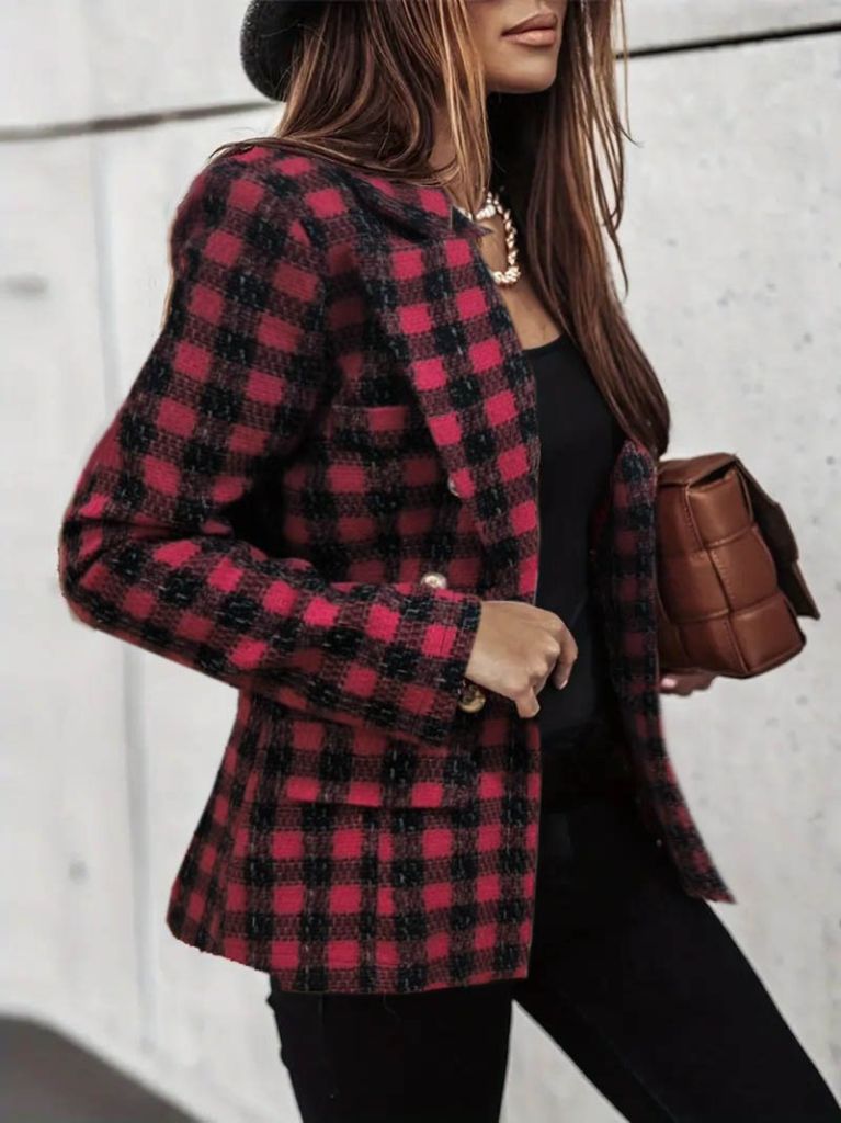 Kadın Uzun Kollu Yakalı Kare Desenli Ekoseli Düğmeli Ceket