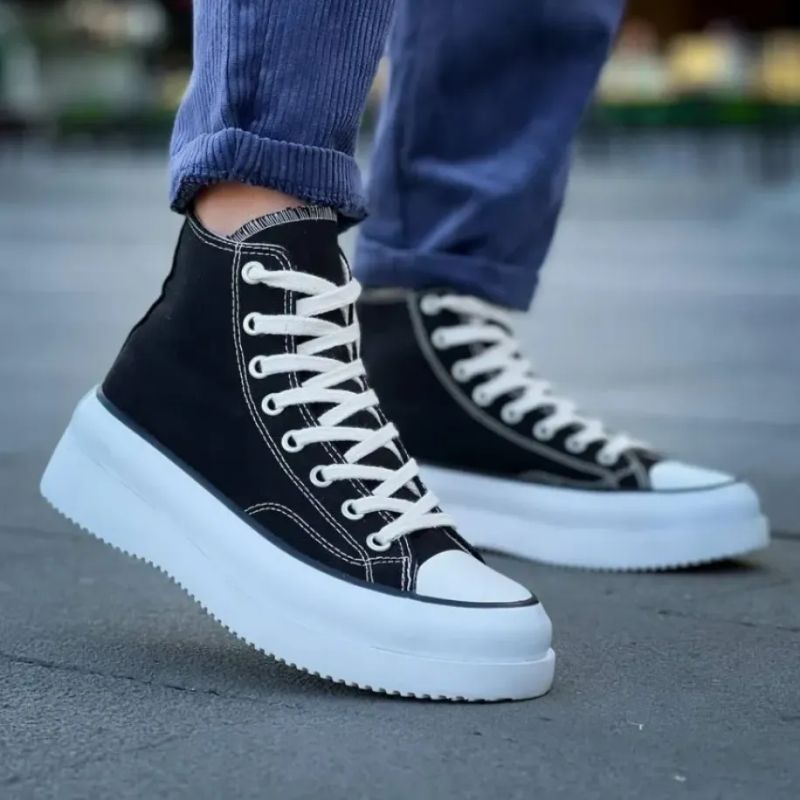 Klasik yüksek bilekli kanvas ruhunu, modern ve iddialı bir yüksek tabanla yeniden yorumladık! KB-CX-3 Kuback, siyah ketenin zamansız şıklığını kontrast beyaz tabanla birleştirerek sokak stiline yeni bir soluk getiriyor. Hem konforlu yapısı hem de dikkat çekici silüetiyle her adımda fark edilmek isteyenler için tasarlandı.