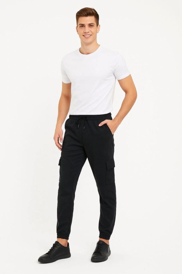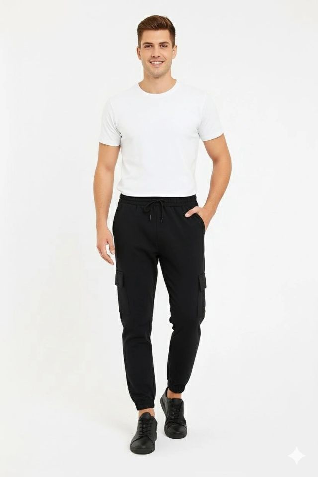 Erkek Siyah Jogger Eşofman Altı Rahat Kalıp, Kargo Cepli, Lastikli Paça, Günlük Spor Pantolon - Siyah