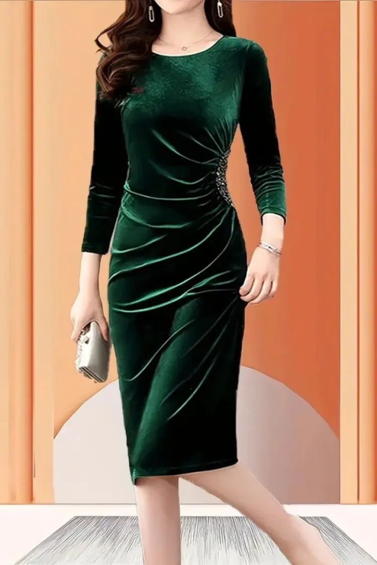 Kadın Uzun Kollu Yakası Açık Yanlardan Büzgülü Taş Detaylı Midi Kadife Elbise