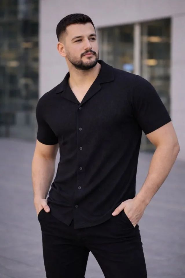 Erkek Waffle Dokuma Açık Yakalı Düğmeli Regular Kalıp 2’li Gömlek Seti - Siyah - Beyaz