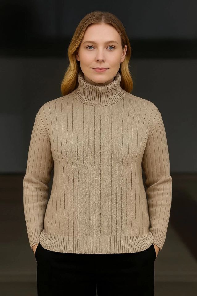 Balıkcı Yaka Bağazlı Triko Kazak Pamuklu Kalın Fitilli Dokuma - Bej